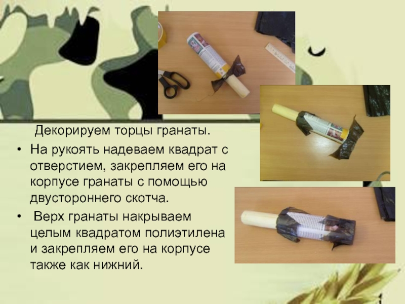 Слайд 10Для оформления «гранаты» используем полиэтиленовый пакет черного или темно-серого цвета (металлизируем