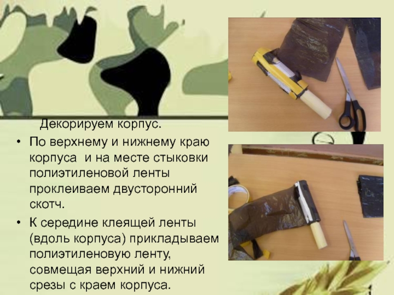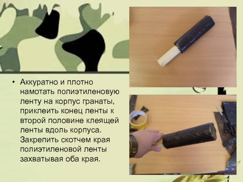 Слайд 14Аккуратно и плотно намотать полиэтиленовую ленту на корпус гранаты, приклеить конец