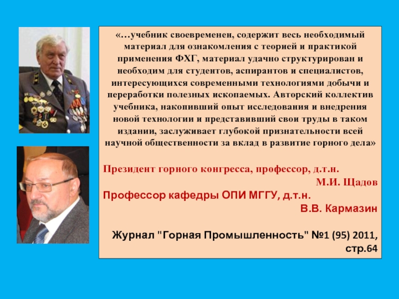 В решении научной конференции «Физико-химическая геотехнология» (МГГУ и РАЕН 12 - 13 ноября 2013 г.) подчеркнута определяющая роль ФХГ в современном горном деле.