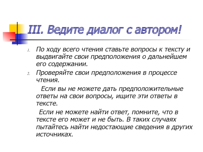 После этого приступайте к чтению. Читая, сопоставляйте выдвинутые вами предположения с реальным содержанием текста.