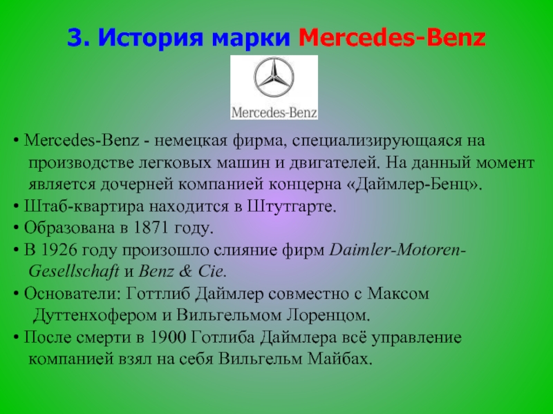 Mercedes-Benz - немецкая фирма, специализирующаяся на