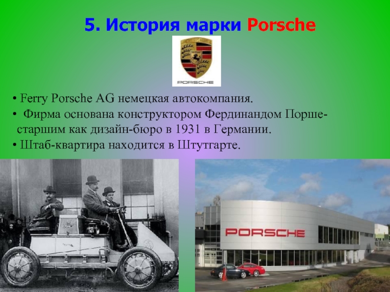 основана конструктором Фердинандом Порше-старшим как дизайн-бюро в 1931 в Германии.