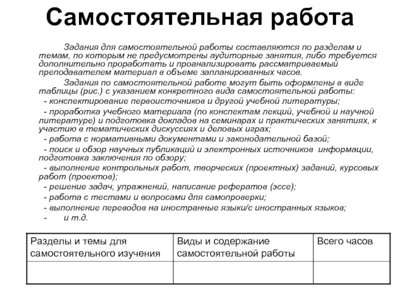 Задания по самостоятельной работе могут быть оформлены в виде таблицы (рис.) с указанием конкретного вида самостоятельной работы: