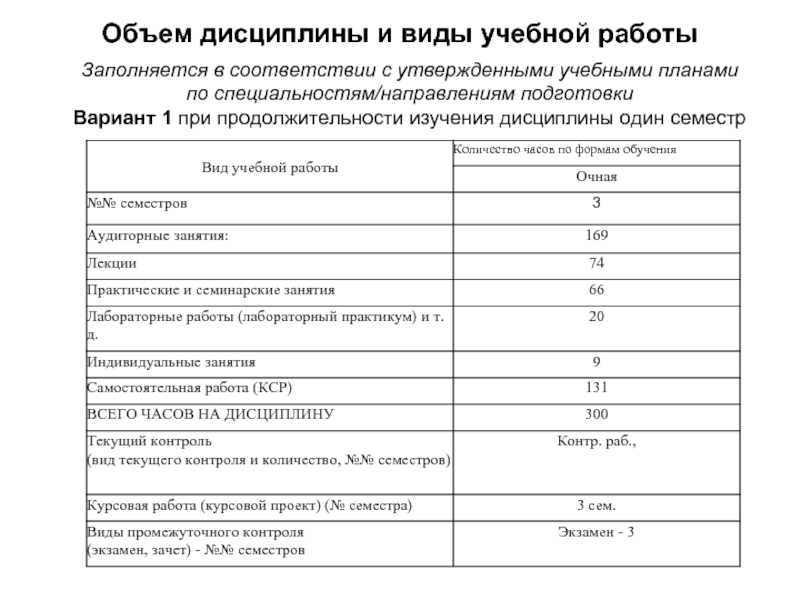 - содержание дисциплины, структурированное по видами учебных занятий с указанием их объемов;