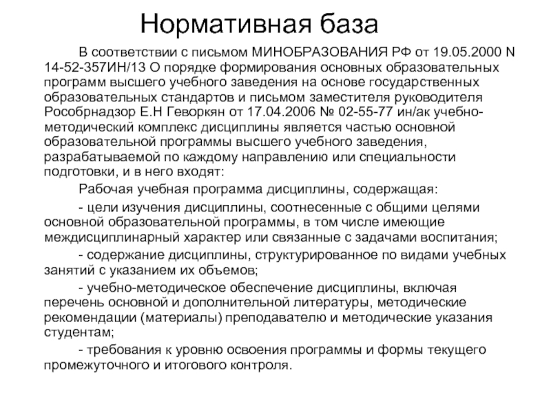 О порядке формирования основных образовательных программ высшего учебного заведения на основе государственных образовательных стандартов и письмом заместителя руководителя Рособрнадзор Е.Н Геворкян от 17.04.2006 № 02-55-77 ин/ак учебно-методический комплекс дисциплины является частью основной образовательной программы высшего учебного заведения, разрабатываемой по каждому направлению или специальности подготовки, и в него входят: