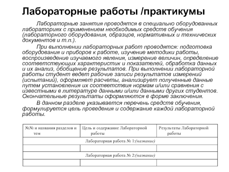 При выполнении лабораторных работ проводятся: подготовка оборудования и приборов к работе, изучение методики работы, воспроизведение изучаемого явления, измерение величин, определение соответствующих характеристик и показателей, обработка данных и их анализ, обобщение результатов. При выполнении лабораторной работы студент ведет рабочие записи результатов измерений (испытаний), оформляет расчеты, анализирует полученные данные путем установления их соответствия нормам и/или сравнения с известными в литературе данными и/или данными других студентов. Окончательные результаты оформляются в форме заключения.