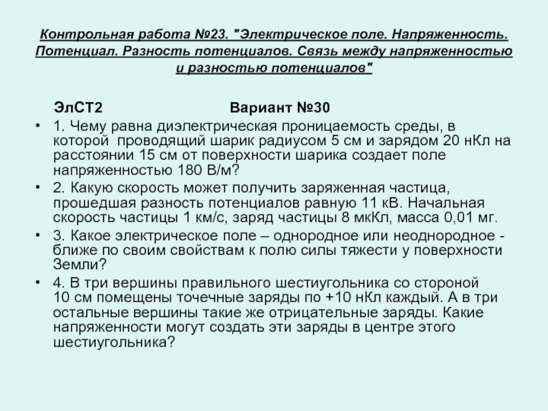 1. Чему равна диэлектрическая проницаемость среды, в которой проводящий шарик радиусом 5 см и зарядом 20 нКл на расстоянии 15 см от поверхности шарика создает поле напряженностью 180 В/м?