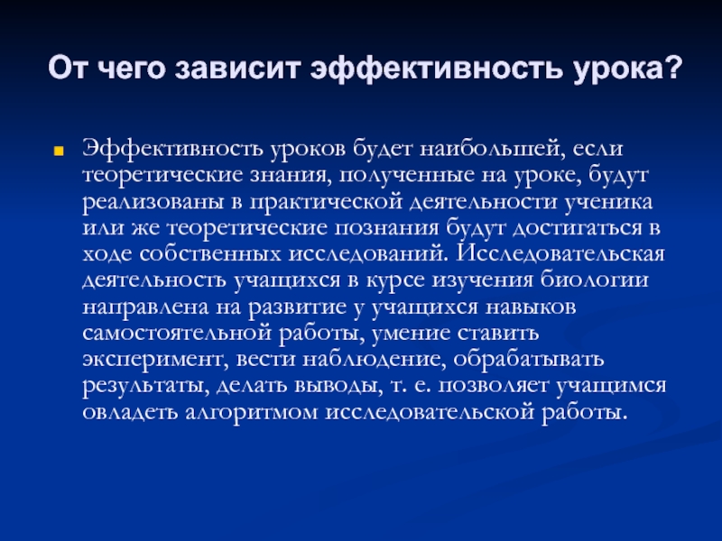 полученные на уроке, будут реализованы в практической деятельности ученика или же теоретические познания будут достигаться в ходе собственных исследований. Исследовательская деятельность учащихся в курсе изучения биологии направлена на развитие у учащихся навыков самостоятельной работы, умение ставить эксперимент, вести наблюдение, обрабатывать результаты, делать выводы, т. е. позволяет учащимся овладеть алгоритмом исследовательской работы.