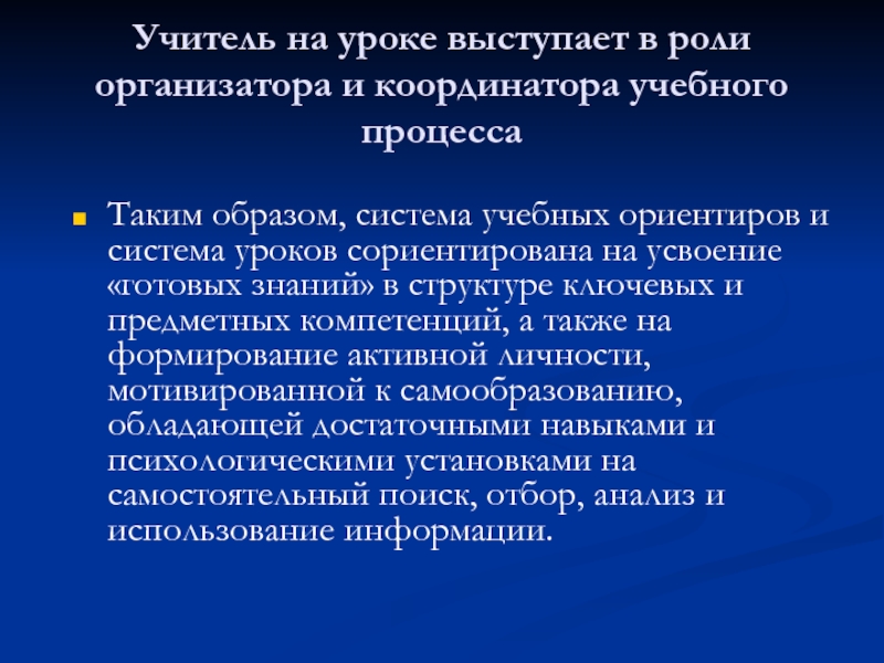 образом, система учебных ориентиров и система уроков сориентирована на усвоение «готовых знаний» в структуре ключевых и предметных компетенций, а также на формирование активной личности, мотивированной к самообразованию, обладающей достаточными навыками и психологическими установками на самостоятельный поиск, отбор, анализ и использование информации.