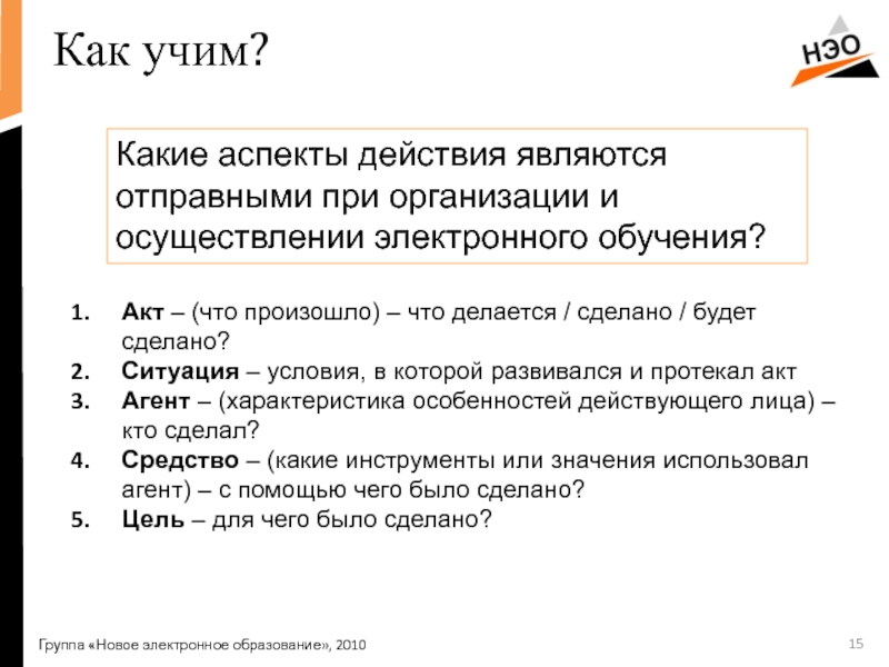 Какие аспекты действия являются предметом изучения в ходе электронного обучения?