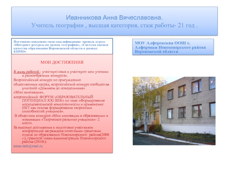 Постоянно повышаю свою квалификацию: прошла курсы «Интернет-ресурсы на уроках географии», «Система оценки качества образования Воронежской области в рамках КПМО»