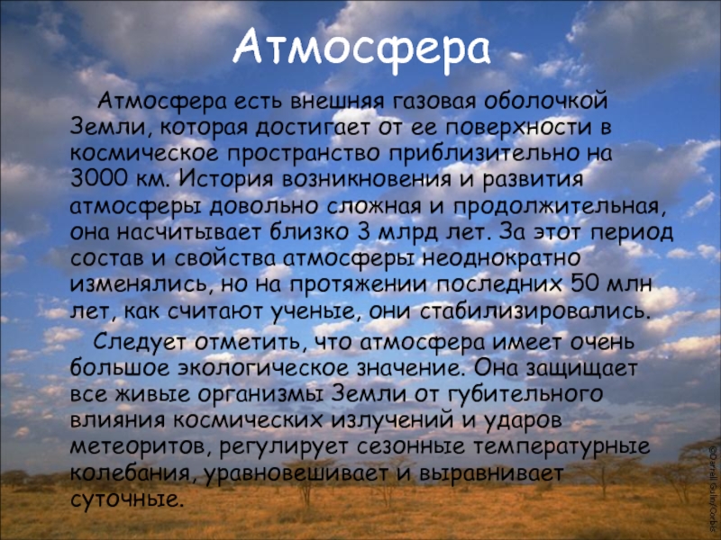 достигает от ее поверхности в космическое пространство приблизительно на 3000 км. История возникновения и развития атмосферы довольно сложная и продолжительная, она насчитывает близко 3 млрд лет. За этот период состав и свойства атмосферы неоднократно изменялись, но на протяжении последних 50 млн лет, как считают ученые, они стабилизировались.