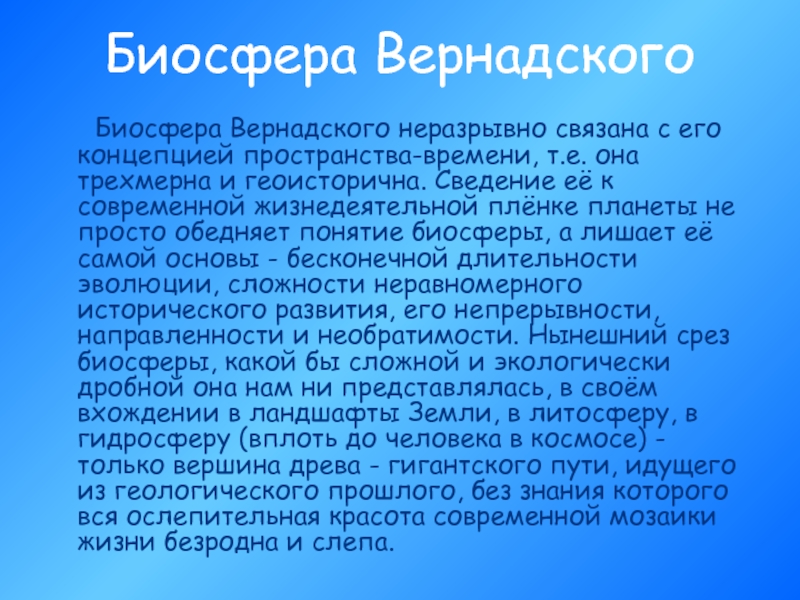 пространства-времени, т.е. она трехмерна и геоисторична. Сведение её к современной жизнедеятельной плёнке планеты не просто обедняет понятие биосферы, а лишает её самой основы - бесконечной длительности эволюции, сложности неравномерного исторического развития, его непрерывности, направленности и необратимости. Нынешний срез биосферы, какой бы сложной и экологически дробной она нам ни представлялась, в своём вхождении в ландшафты Земли, в литосферу, в гидросферу (вплоть до человека в космосе) - только вершина древа - гигантского пути, идущего из геологического прошлого, без знания которого вся ослепительная красота современной мозаики жизни безродна и слепа.