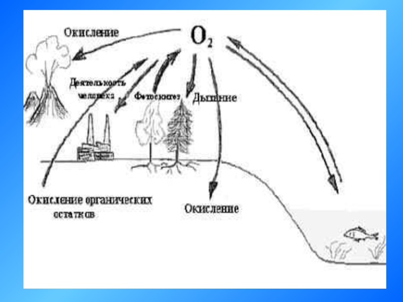 пределах биосферы происходит быстрый обмен кислорода среды с живыми организмами или их остатками после гибели. В составе земной атмосферы кислород занимает второе место после азота. Господствующей формой нахождения кислорода в атмосфере является молекула О2. Круговорот кислорода в биосфере весьма сложен, поскольку он вступает во множество химических соединений минерального и органического миров. Свободный кислород современной земной атмосферы является побочным продуктом процесса фотосинтеза зеленых растений и его общее количество отражает баланс между продуцированием кислорода и процессами окисления и гниения различных веществ. В истории биосферы Земли наступило такое время, когда количество свободного кислорода достигло определенного уровня и оказалось сбалансированным таким образом, что количество выделяемого кислорода стало равным количеству поглощаемого кислорода.