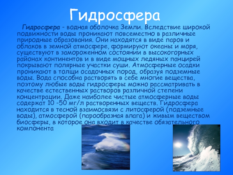 воды проникают повсеместно в различные природные образования. Они находятся в виде паров и облаков в земной атмосфере, формируют океаны и моря, существуют в замороженном состоянии в высокогорных районах континентов и в виде мощных ледяных панцирей покрывают полярные участки суши. Атмосферные осадки проникают в толщи осадочных пород, образуя подземные воды. Вода способна растворять в себе многие вещества, поэтому любые воды гидросферы можно рассматривать в качестве естественных растворов различной степени концентрации. Даже наиболее чистые атмосферные воды содержат 10 -50 мг/л растворенных веществ. Гидросфера находится в тесной взаимосвязи с литосферой (подземные воды), атмосферой (парообразная влага) и живым веществом биосферы, в которое она входит в качестве обязательного компонента