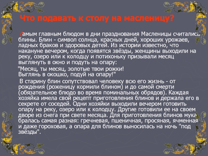 в дни празднования Масленицы считались блины. Блин - символ солнца, красных дней, хороших урожаев, ладных браков и здоровых детей. Из истории известно, что накануне вечером, когда появятся звёзды, женщины выходили на реку, озеро или к колодцу и потихоньку призывали месяц выглянуть в окно и подуть на опару: