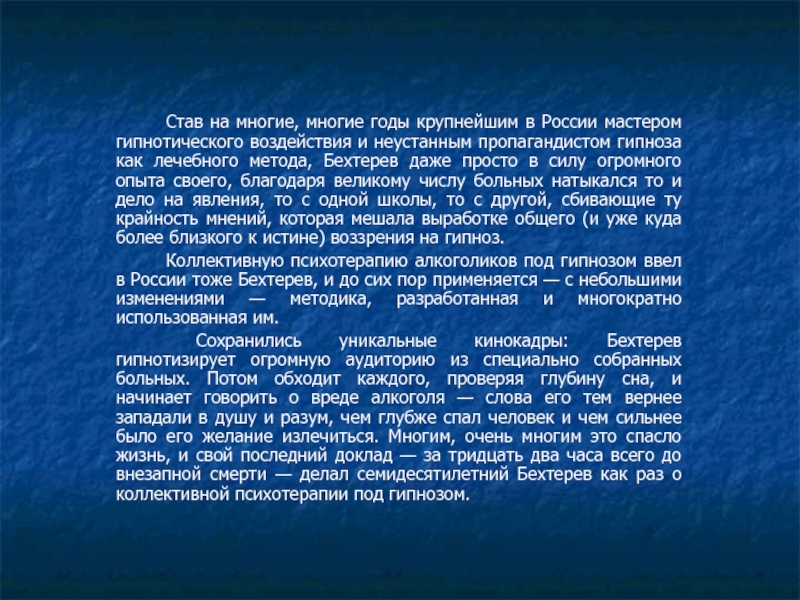 Сохранились уникальные кинокадры: Бехтерев гипнотизирует огромную аудиторию из специально собранных больных. Потом обходит каждого, проверяя глубину сна, и начинает говорить о вреде алкоголя — слова его тем вернее западали в душу и разум, чем глубже спал человек и чем сильнее было его желание излечиться. Многим, очень многим это спасло жизнь, и свой последний доклад — за тридцать два часа всего до внезапной смерти — делал семидесятилетний Бехтерев как раз о коллективной психотерапии под гипнозом.