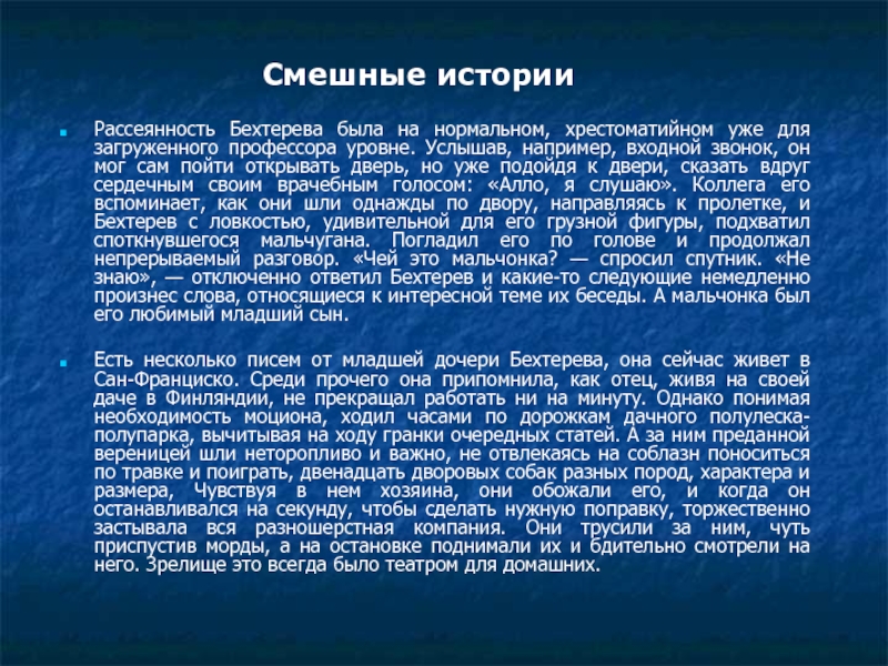 Есть несколько писем от младшей дочери Бехтерева, она сейчас живет в Сан-Франциско. Среди прочего она припомнила, как отец, живя на своей даче в Финляндии, не прекращал работать ни на минуту. Однако понимая необходимость моциона, ходил часами по дорожкам дачного полулеска-полупарка, вычитывая на ходу гранки очередных статей. А за ним преданной вереницей шли неторопливо и важно, не отвлекаясь на соблазн поноситься по травке и поиграть, двенадцать дворовых собак разных пород, характера и размера, Чувствуя в нем хозяина, они обожали его, и когда он останавливался на секунду, чтобы сделать нужную поправку, торжественно застывала вся разношерстная компания. Они трусили за ним, чуть приспустив морды, а на остановке поднимали их и бдительно смотрели на него. Зрелище это всегда было театром для домашних.