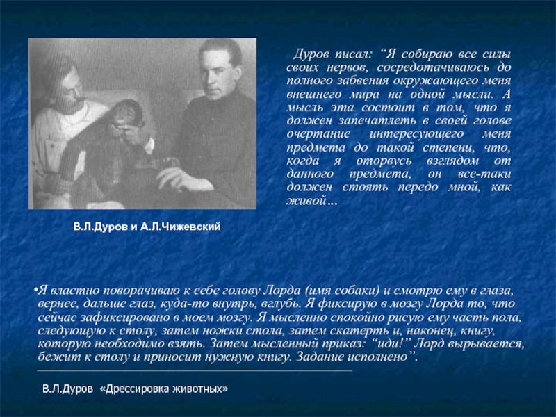 В 1924 году председатель Ученого Совета лаборатории зоопсихологии В.Дуров издает книгу «Дрессировка животных», в которой рассказывает об опытах по мысленному внушению.