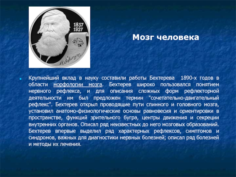 области морфологии мозга. Бехтерев широко пользовался понятием нервного рефлекса, и для описания сложных форм рефлекторной деятельности им был предложен термин "сочетательно-двигательный рефлекс". Бехтерев открыл проводящие пути спинного и головного мозга, установил анатомо-физиологические основы равновесия и ориентировки в пространстве, функций зрительного бугра, центры движения и секреции внутренних органов. Описал ряд неизвестных до него мозговых образований. Бехтерев впервые выделил ряд характерных рефлексов, симптомов и синдромов, важных для диагностики нервных болезней; описал ряд болезней и методы их лечения.