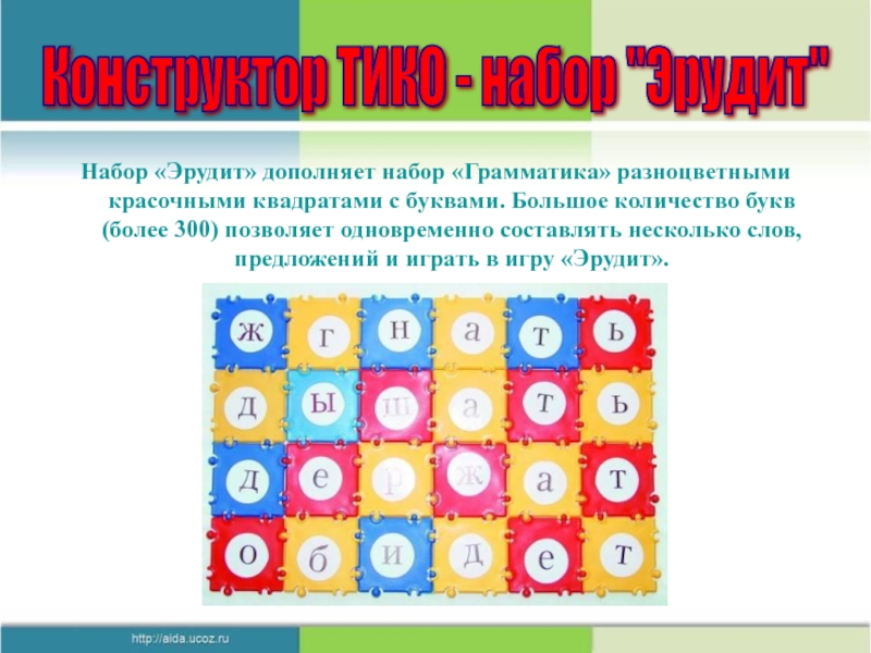 Слайд 25Набор «Эрудит» дополняет набор «Грамматика» разноцветными красочными квадратами с буквами. Большое