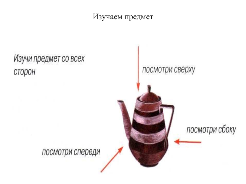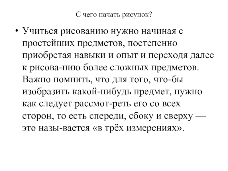 приобретая навыки и опыт и переходя далее к рисованию более сложных предметов. Важно помнить, что для того, чтобы изобразить какой-нибудь предмет, нужно как следует рассмотреть его со всех сторон, то есть спереди, сбоку и сверху — это называется «в трёх измерениях».