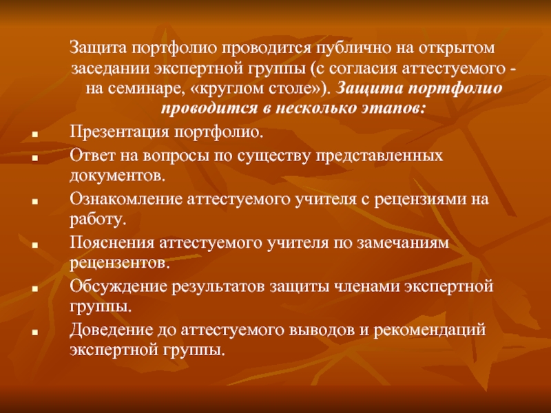 (с согласия аттестуемого - на семинаре, «круглом столе»). Защита портфолио проводится в несколько этапов: