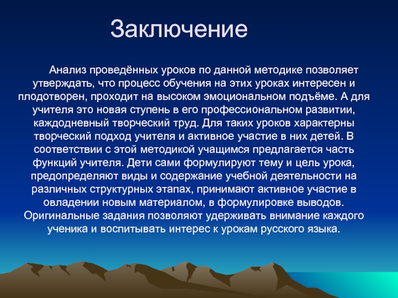 на этих уроках интересен и плодотворен, проходит на высоком эмоциональном подъёме. А для учителя это новая ступень в его профессиональном развитии, каждодневный творческий труд. Для таких уроков характерны творческий подход учителя и активное участие в них детей. В соответствии с этой методикой учащимся предлагается часть функций учителя. Дети сами формулируют тему и цель урока, предопределяют виды и содержание учебной деятельности на различных структурных этапах, принимают активное участие в овладении новым материалом, в формулировке выводов. Оригинальные задания позволяют удерживать внимание каждого ученика и воспитывать интерес к урокам русского языка.