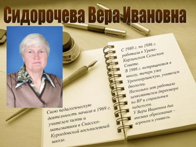 Свою педагогическую деятельность начала в 1969 г. учителем химии и математики в Спасско-Куроедовской восьмилетней школе.