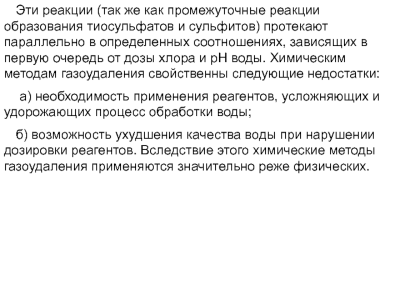 протекают параллельно в определенных соотношениях, зависящих в первую очередь от дозы хлора и рН воды. Химическим методам газоудаления свойственны следующие недостатки: