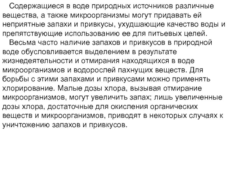 Весьма часто наличие запахов и привкусов в природной воде обусловливается выделением в результате жизнедеятельности и отмирания находящихся в воде микроорганизмов и водорослей пахнущих веществ. Для борьбы с этими запахами и привкусами можно применять хлорирование. Малые дозы хлора, вызывая отмирание микроорганизмов, могут увеличить запах; лишь увеличенные дозы хлора, достаточные для окисления органических веществ и микроорганизмов, приводят в некоторых случаях к уничтожению запахов и привкусов.