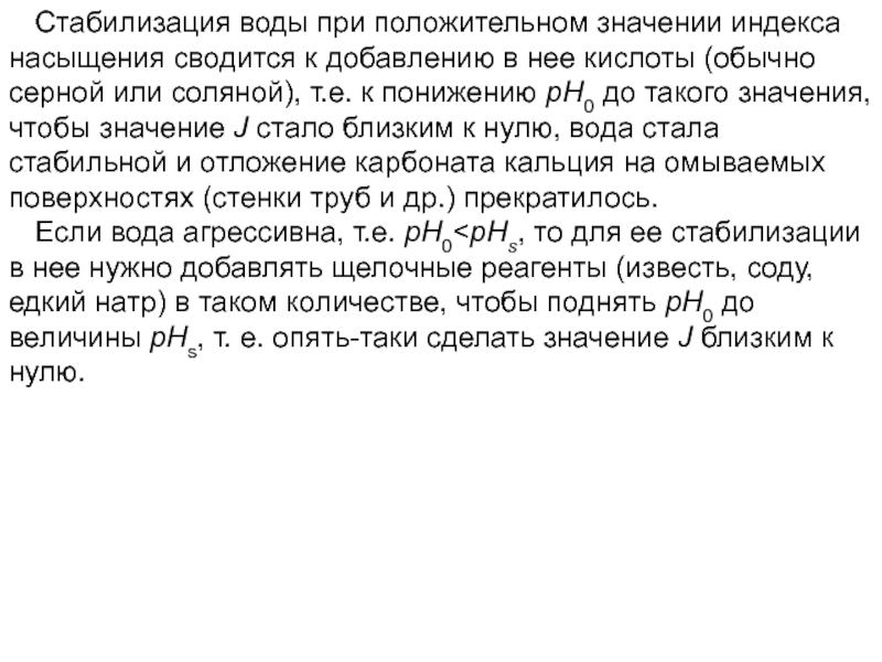 Слайд 10Стабилизация воды при положительном значении индекса насыщения сводится к добавлению в
