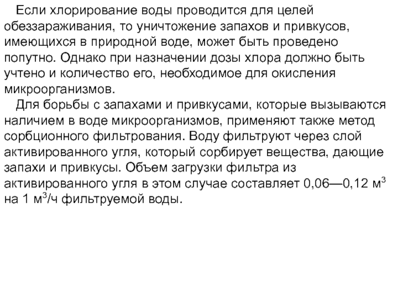 Для борьбы с запахами и привкусами, которые вызываются наличием в воде микроорганизмов, применяют также метод сорбционного фильтрования. Воду фильтруют через слой активированного угля, который сорбирует вещества, дающие запахи и привкусы. Объем загрузки фильтра из активированного угля в этом случае составляет 0,06—0,12 м3 на 1 м3/ч фильтруемой воды.