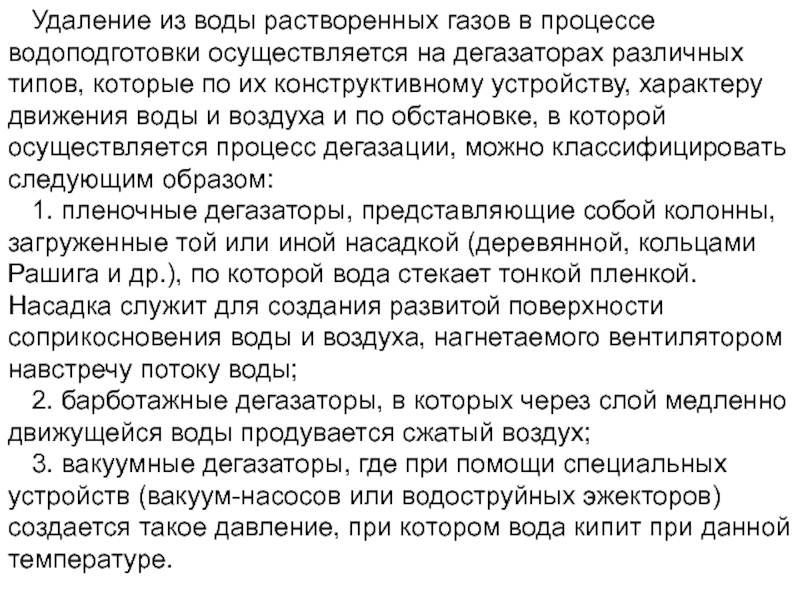 различных типов, которые по их конструктивному устройству, характеру движения воды и воздуха и по обстановке, в которой осуществляется процесс дегазации, можно классифицировать следующим образом: