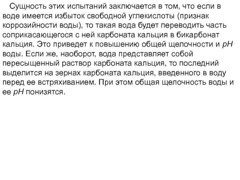 избыток свободной углекислоты (признак коррозийности воды), то такая вода будет переводить часть соприкасающегося с ней карбоната кальция в бикарбонат кальция. Это приведет к повышению общей щелочности и рН воды. Если же, наоборот, вода представляет собой пересыщенный раствор карбоната кальция, то последний выделится на зернах карбоната кальция, введенного в воду перед ее встряхиванием. При этом общая щелочность воды и ее рН понизятся.
