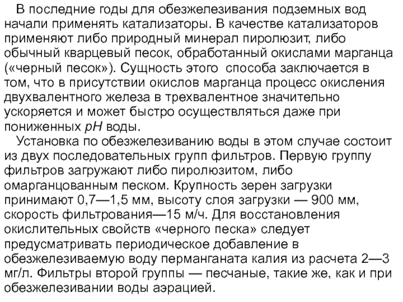 качестве катализаторов применяют либо природный минерал пиролюзит, либо обычный кварцевый песок, обработанный окислами марганца («черный песок»). Сущность этого способа заключается в том, что в присутствии окислов марганца процесс окисления двухвалентного железа в трехвалентное значительно ускоряется и может быстро осуществляться даже при пониженных рН воды.