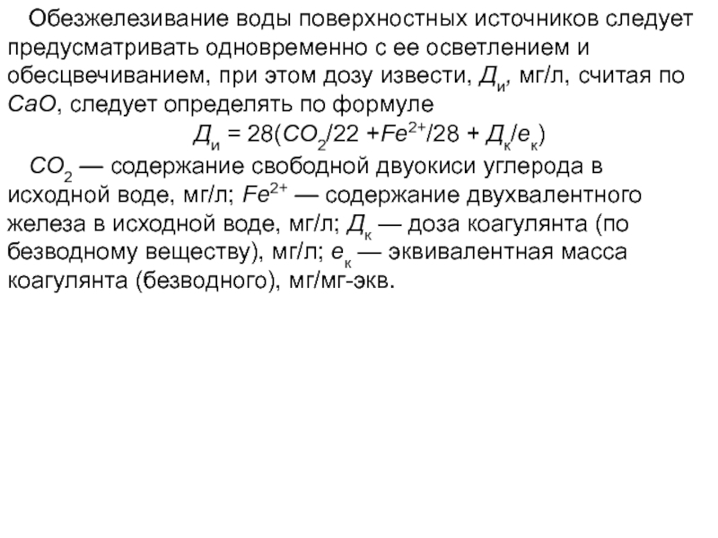 СО2 — содержание свободной двуокиси углерода в исходной воде, мг/л; Fе2+ — содержание двухвалентного железа в исходной воде, мг/л; Дк — доза коагулянта (по безводному веществу), мг/л; ек — эквивалентная масса коагулянта (безводного), мг/мг-экв.