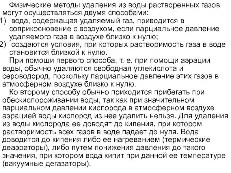 Слайд 30Физические методы удаления из воды растворенных газов могут осуществляться двумя способами: