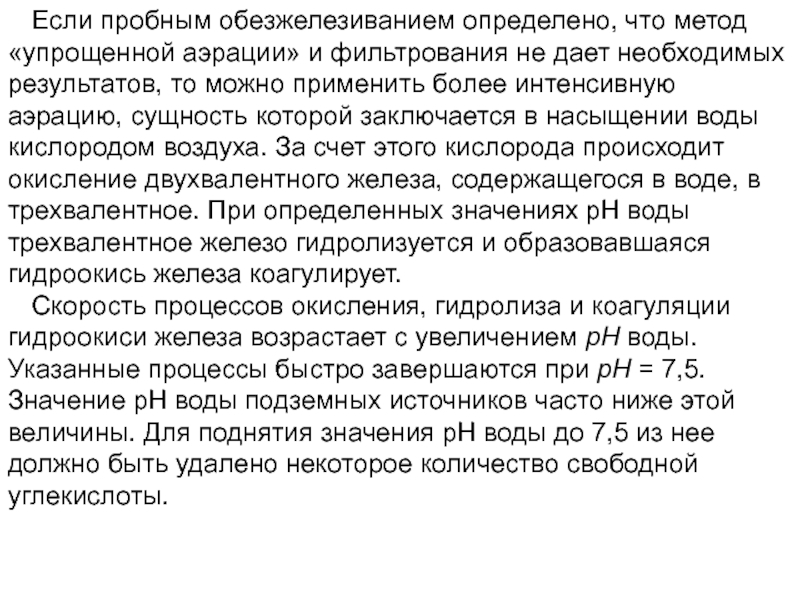 Скорость процессов окисления, гидролиза и коагуляции гидроокиси железа возрастает с увеличением рН воды. Указанные процессы быстро завершаются при рН = 7,5. Значение рН воды подземных источников часто ниже этой величины. Для поднятия значения рН воды до 7,5 из нее должно быть удалено некоторое количество свободной углекислоты.