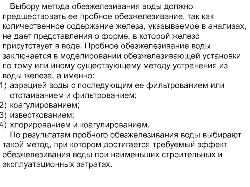 Слайд 14Выбору метода обезжелезивания воды должно предшествовать ее пробное обезжелезивание, так как