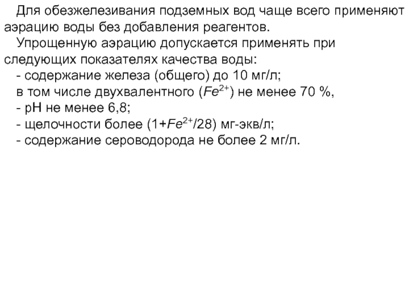 Упрощенную аэрацию допускается применять при следующих показателях качества воды: