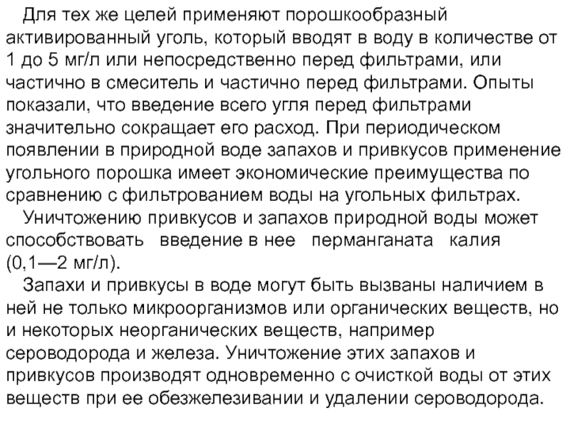 воду в количестве от 1 до 5 мг/л или непосредственно перед фильтрами, или частично в смеситель и частично перед фильтрами. Опыты показали, что введение всего угля перед фильтрами значительно сокращает его расход. При периодическом появлении в природной воде запахов и привкусов применение угольного порошка имеет экономические преимущества по сравнению с фильтрованием воды на угольных фильтрах.
