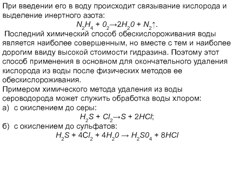 Последний химический способ обескислороживания воды является наиболее совершенным, но вместе с тем и наиболее дорогим ввиду высокой стоимости гидразина. Поэтому этот способ применения в основном для окончательного удаления кислорода из воды после физических методов ее обескислороживания.