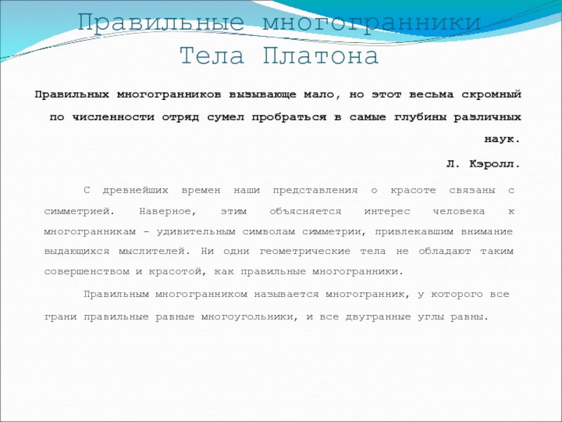 С древнейших времен наши представления о красоте связаны с симметрией. Наверное, этим объясняется интерес человека к многогранникам - удивительным символам симметрии, привлекавшим внимание выдающихся мыслителей. Ни одни геометрические тела не обладают таким совершенством и красотой, как правильные многогранники.