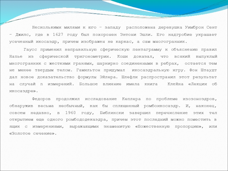 Джилс, где в 1627 году был похоронен Энтони Эшли. Его надгробие украшает усеченный икосаэдр, причем изображен не каркас, а сам многогранник.