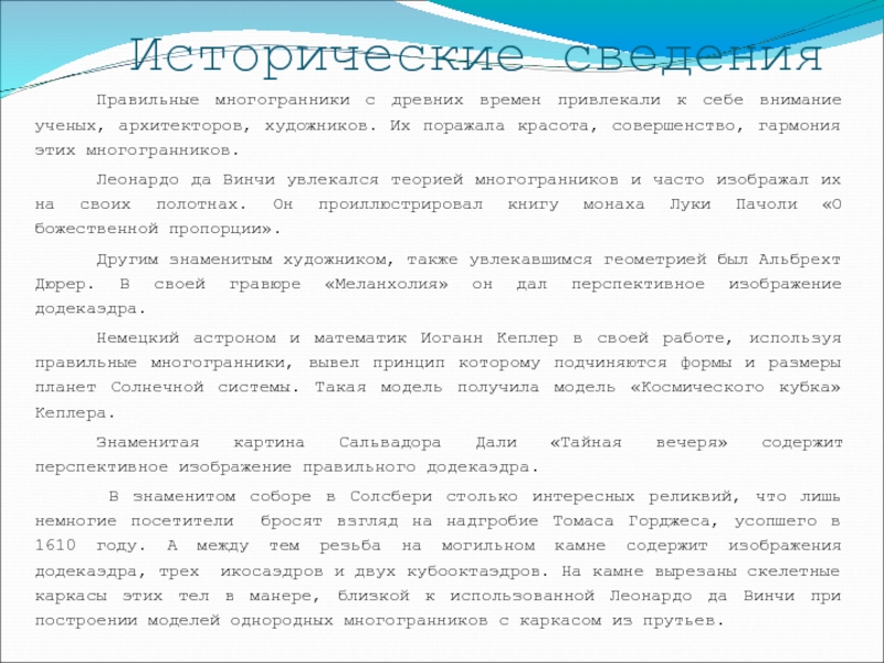 к себе внимание ученых, архитекторов, художников. Их поражала красота, совершенство, гармония этих многогранников.