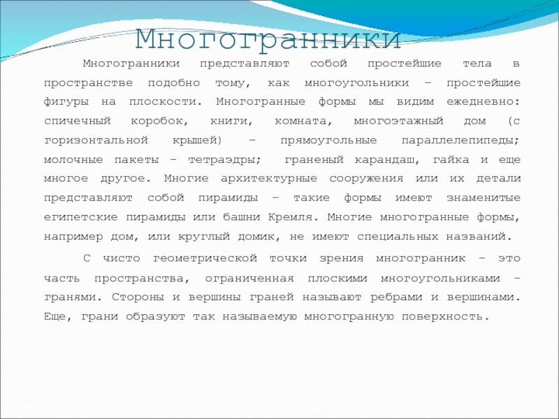 Слайд 6 Многогранники представляют собой простейшие тела в пространстве подобно тому, как многоугольники