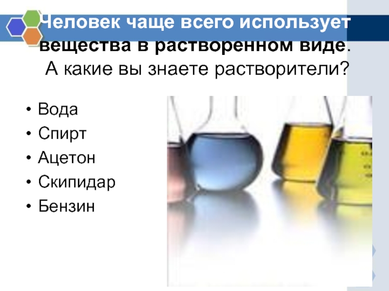 Слайд 16Человек чаще всего использует вещества в растворенном виде.