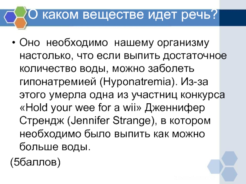 выпить достаточное количество воды, можно заболеть гипонатремией (Hyponatremia). Из-за этого умерла одна из участниц конкурса «Hold your wee for a wii» Дженнифер Стрендж (Jennifer Strange), в котором необходимо было выпить как можно больше воды.