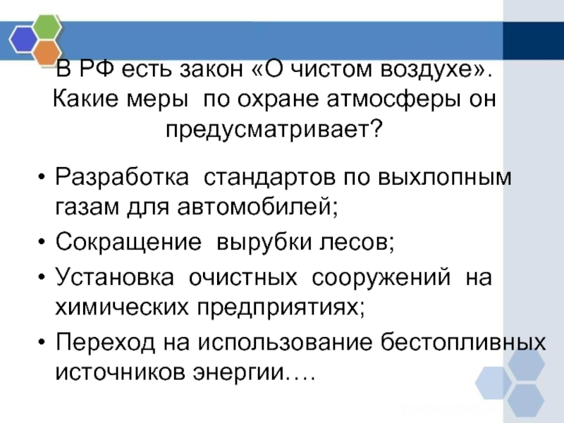 Слайд 14В РФ есть закон «О чистом воздухе».